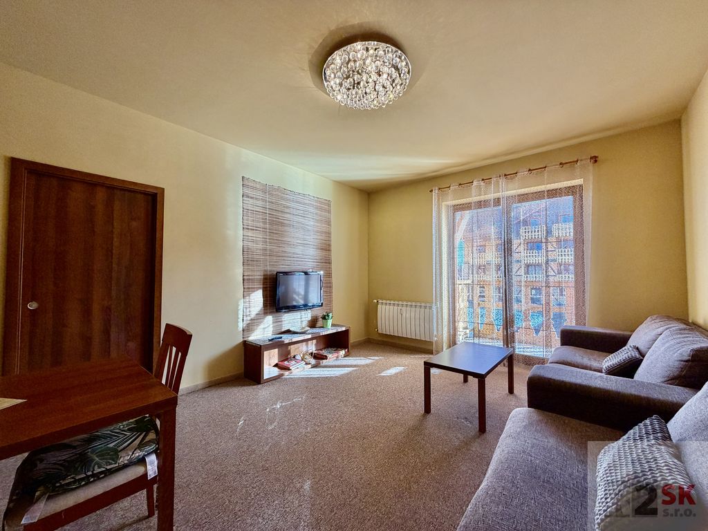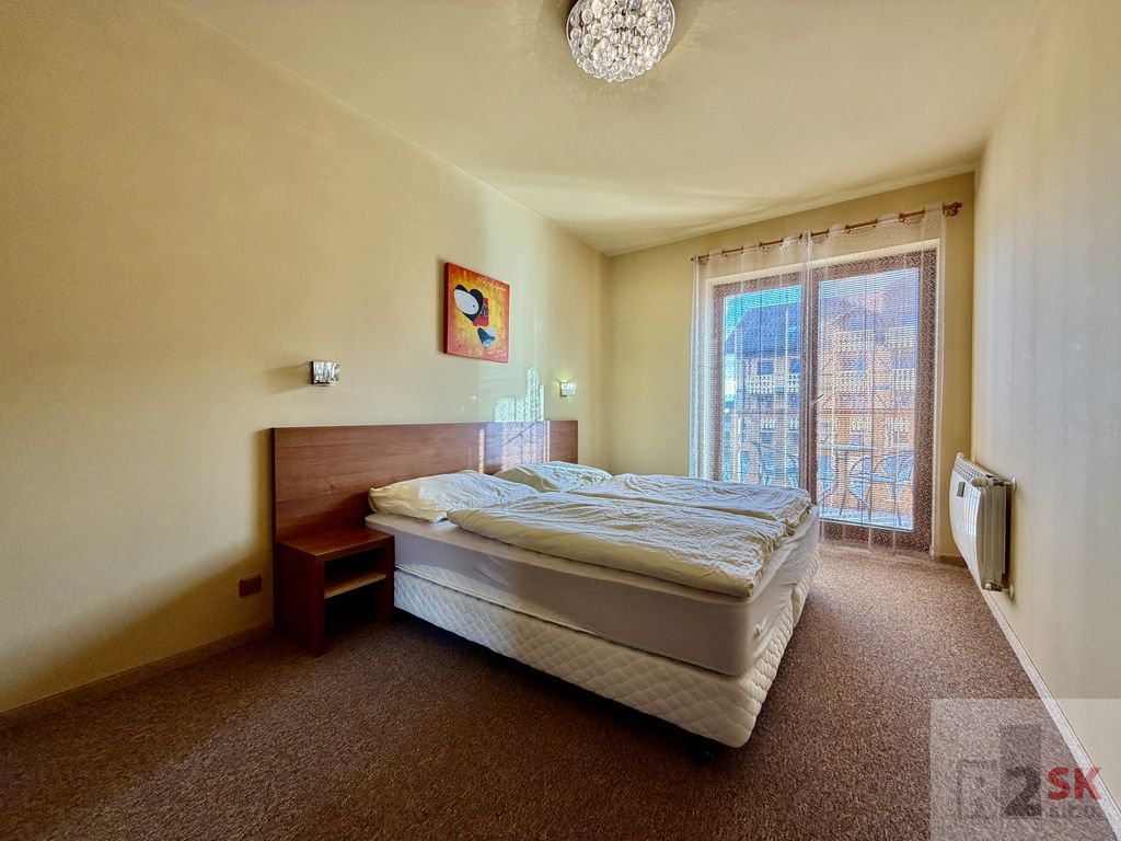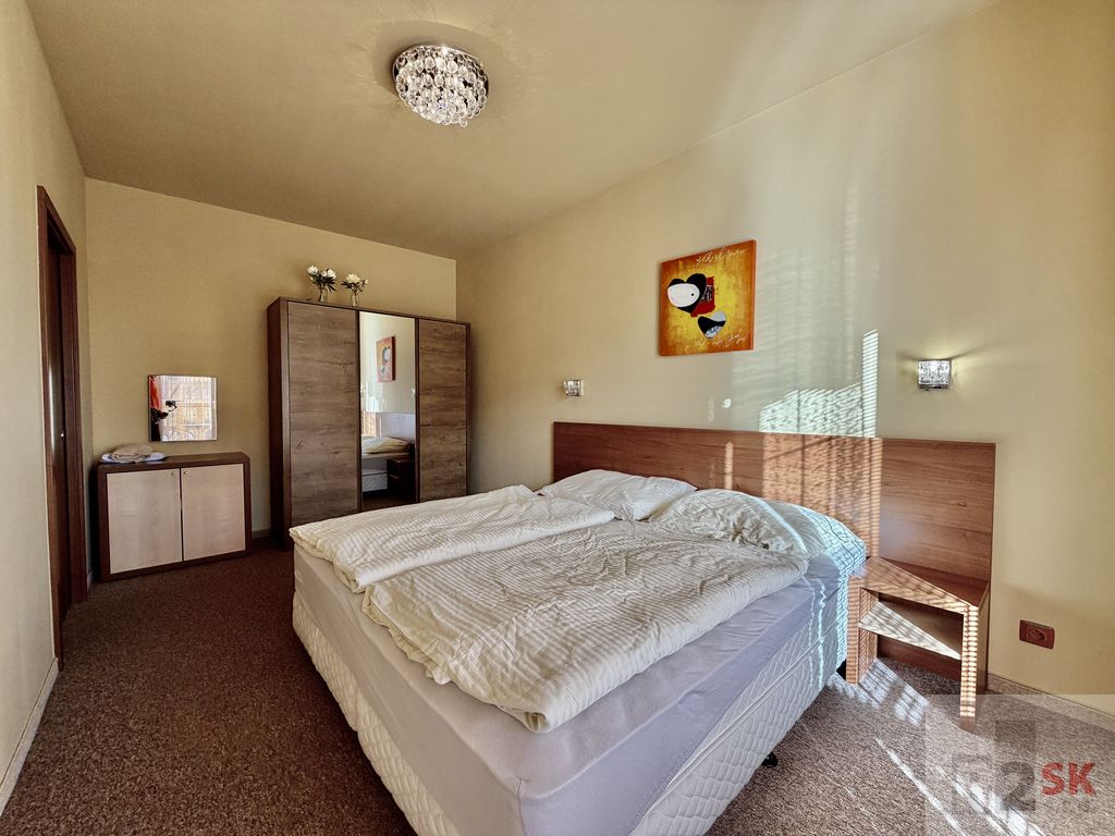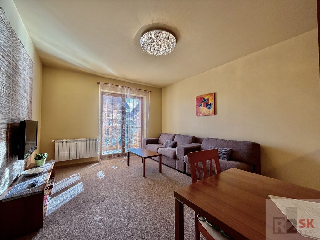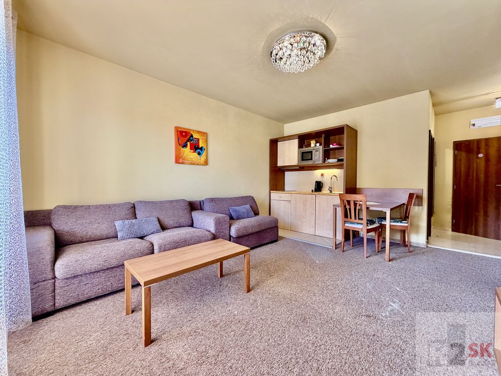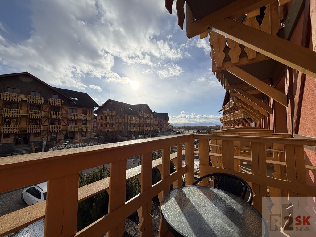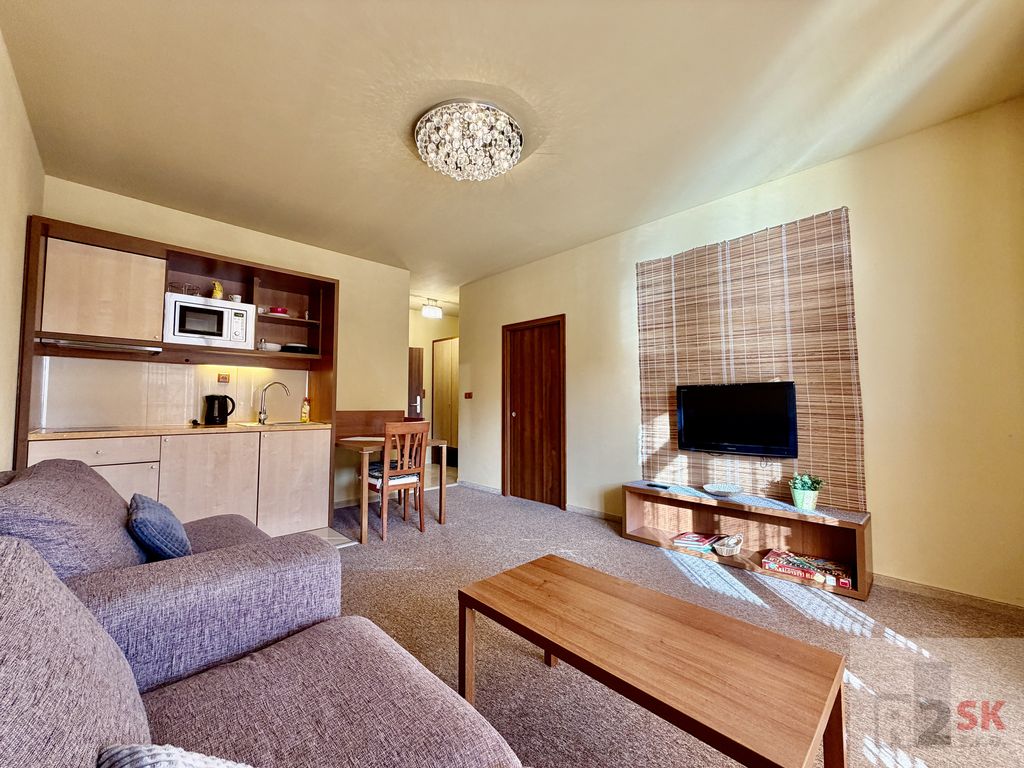 Popis: Ponúkame na predaj 2 izbový apartmán s dvoma balkónmi v Tatragolf Mountain Resorte vo Veľkej Lomnici o výmere 42,36 m² + balkóny /2,36 m² + 2,36 m²/. Apartmán pozostáva zo vstupnej chodby, šatníkovej skrine, kúpeľne s vaňou a WC, veľkej obývacej izby s kuchynským kútom a balkónom /2,36 m²/, spálne s manželskou posteľou hotelového typu s východom na balkón /2,36 m²/. Ideálna dispozícia pre rodiny s deťmi lebo v spálni je možné umiestniť ešte jednu posteľ. Orientácia je SZ. Predáva sa kompletne zariadený s internetom a TV. Ideálne ako investícia na krátkodobý alebo dlhodobý prenájom. Veľmi vyhľadávaná lokalita vedľa golfového areálu a blízkosti lyžiarskeho strediska Tatranská Lomnica. Bohaté možnosti zimnej a letnej turisticky a cyklistiky vďaka veľkému množstvu cyklistických trás. Nízke prevádzkové náklady cca 135,-€/mesiac.